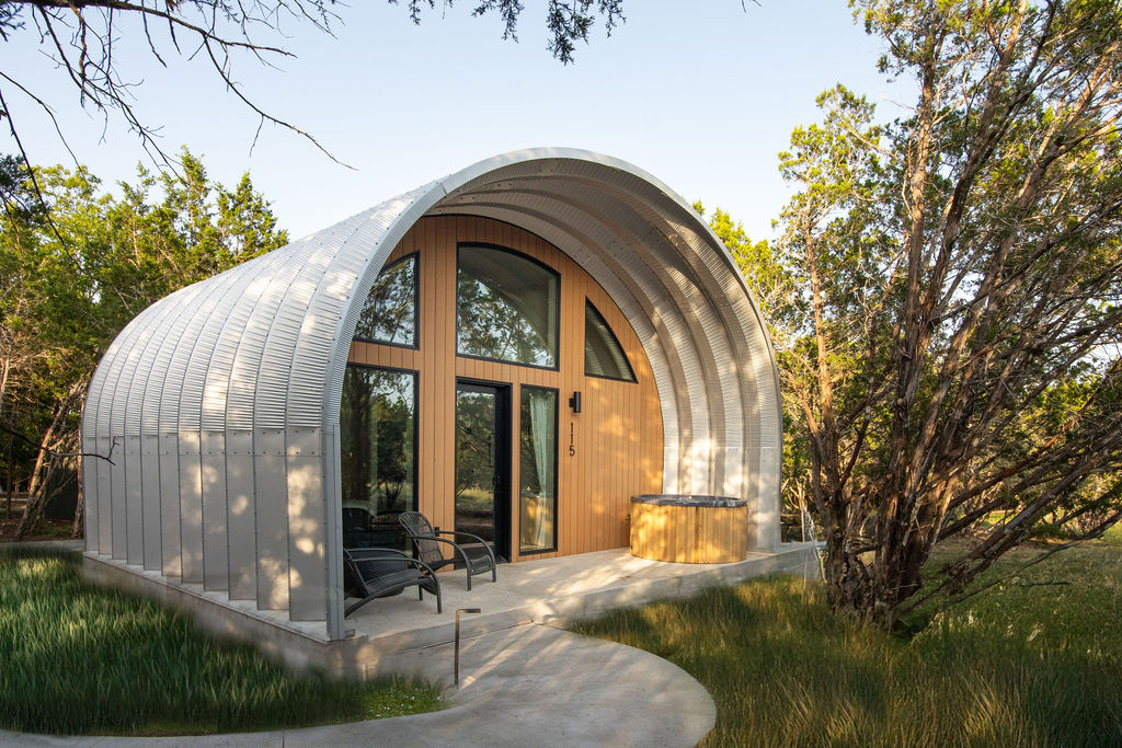 Welcome to our cozy Quonset retreat, a unique and comfortable getaway offering modern amenities in a peaceful setting. This charming space is modeled after the quonset huts made famous as temporary housing during WWII. The modern and luxurious take on this design features its unique arched shape, high ceilings, floor-to-ceiling glass and a cozy kitchenette and bathroom.