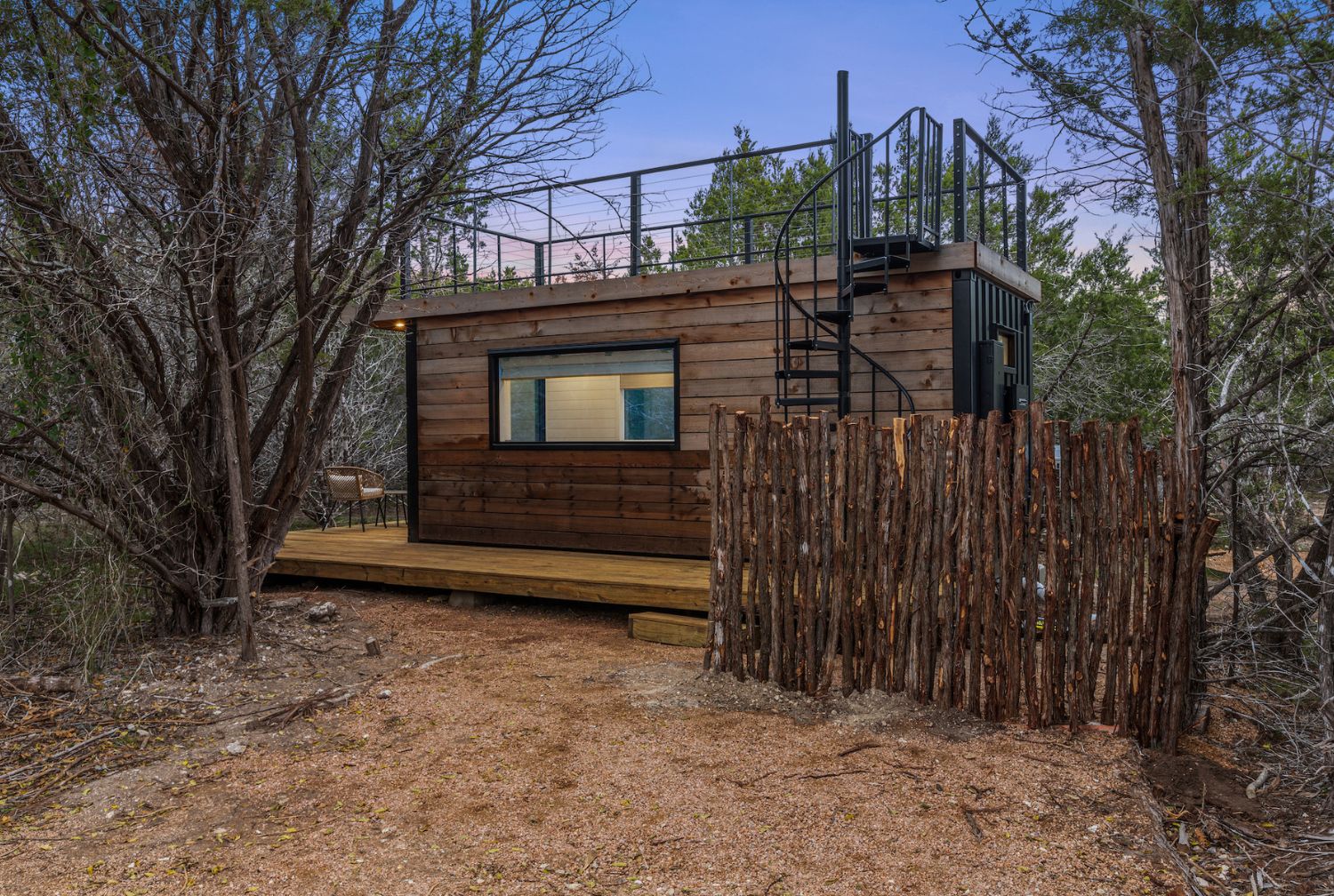 The front side of Cedaar Haus has floor-to-ceiling glass for maximum natural light and unobstructed views of the landscape